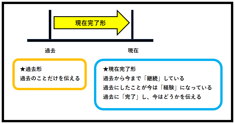 現在完了形は「過去から現在に繋がっている」ということがイメージできるとよいでしょう。